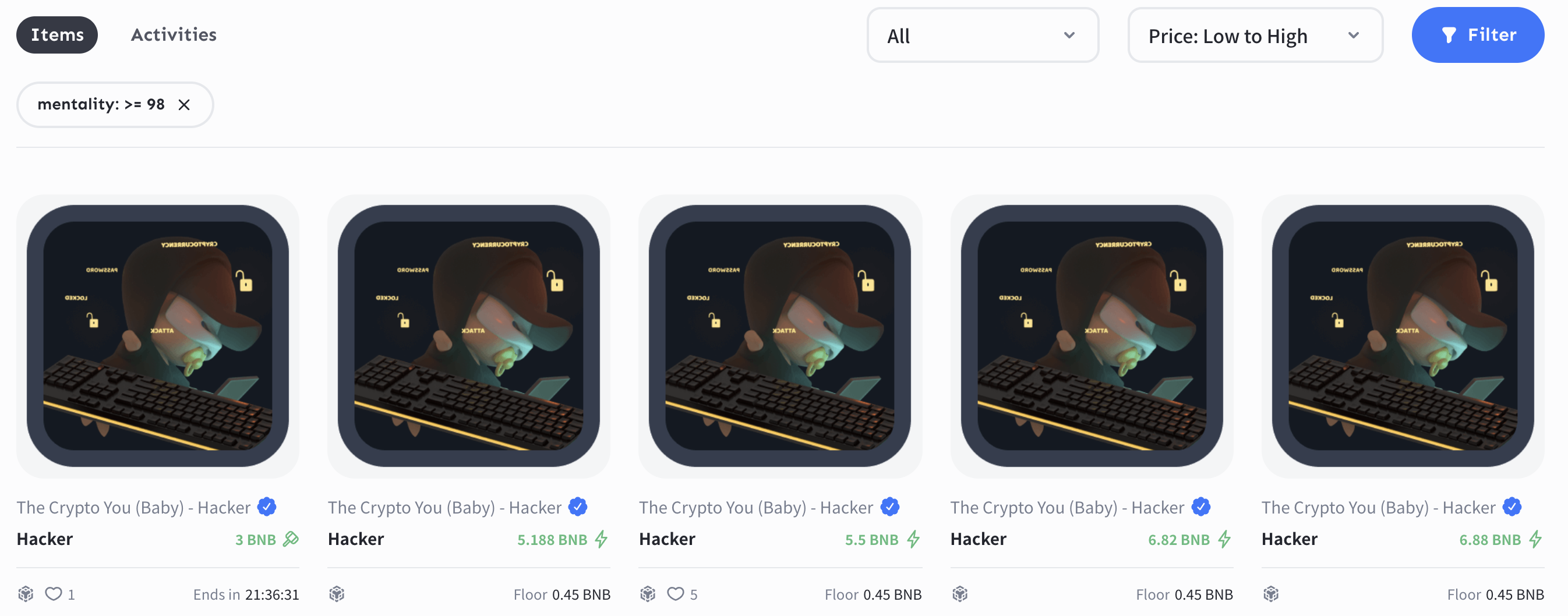 Cryptoyou 마켓이 캐릭별로 구분되어 있다보니 불편함이 있어서 한 군데 정리해 놓습니다. 나중에 마켓이 통합되길 바래봐야겠네요. 각 링크는 즉시 구입가 및 최저가 순서로 정렬된 링크 입니다.